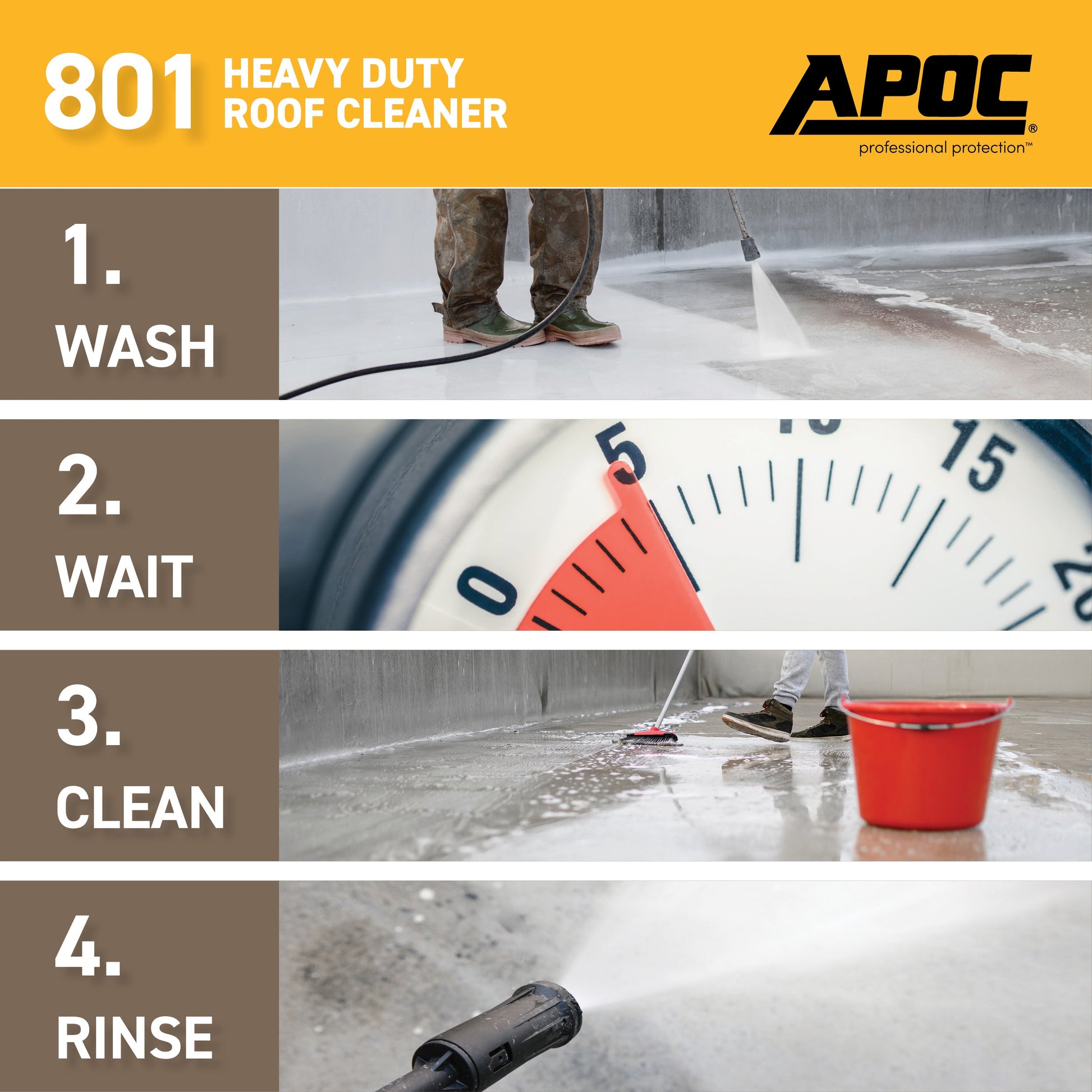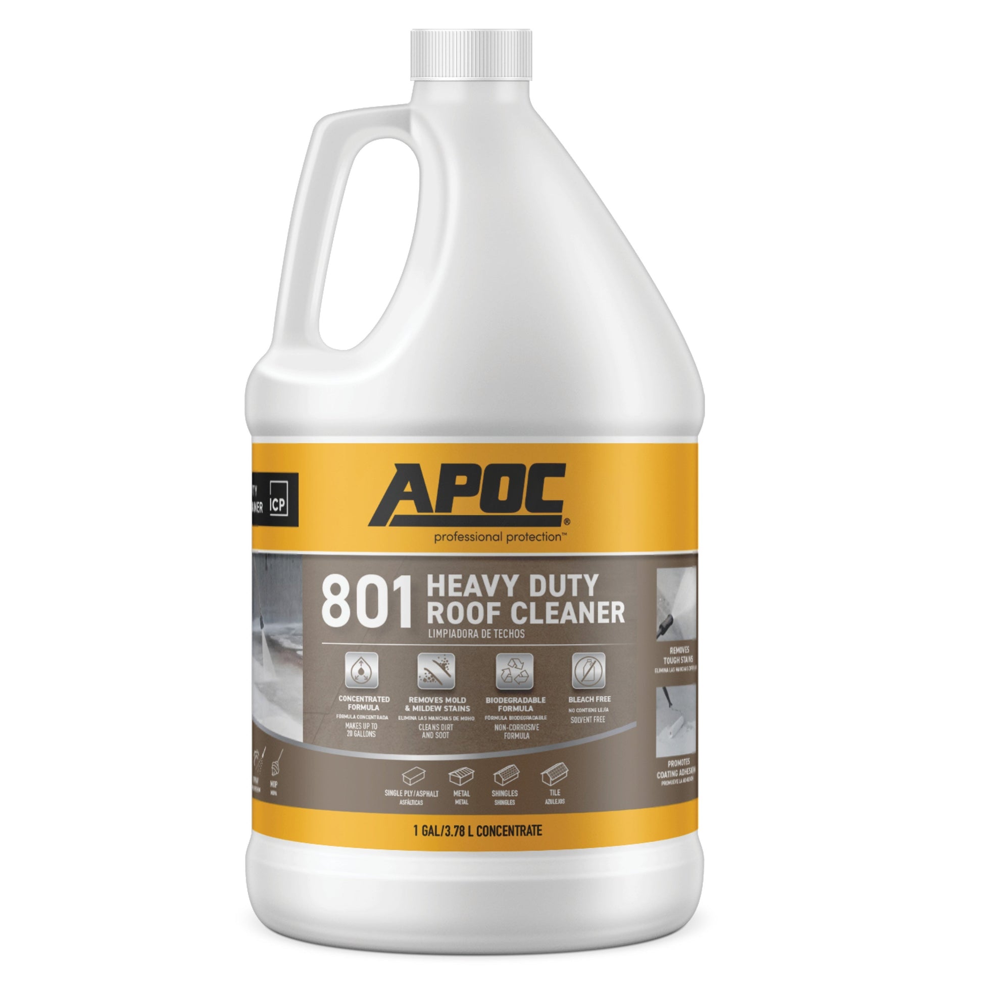 APOC 801 Heavy Duty Roof Cleaner is a high-performance cleaner designed to remove dirt, dust, soot, pollen, and mold/mildew stains from roofing membranes and a variety of other substrates. This concentrated cleaner is the ideal way to prep and clean roof membranes prior to coating with silicone or acrylic roof coatings. APOC 801 is also an excellent choice for cleaning steep slope asphalt shingles. APOC 801 is solvent free, biodegradable, and contains only sustainable ingredients. For use on: single ply/asphalt, metal, shingle, tile roofs and more!